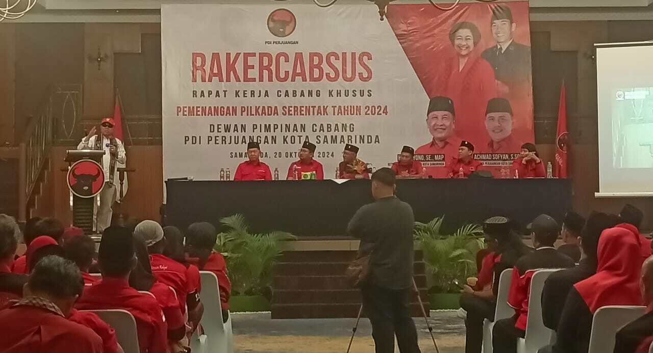 Isran Noor, Sebagai Calon Gubernur Provinsi Kalimantan Timur, Saat Menyampaikan Sambutan di acara Rapat Kerja Cabang Khusus, DPC PDI Perjuangan Kota Samarinda.Samarinda- Dewan Pimpinan Cabang (DPC) PDI Perjuangan Kota Samarinda menggelar Rapat Kerja Cabang Khusus (Rakercabsus) Pemenangan Pemilihan Kepala Daerah Kota Samarinda 2024, di Hotel Senyiur Samarinda, Kaltim, Minggu (20/10/2024).